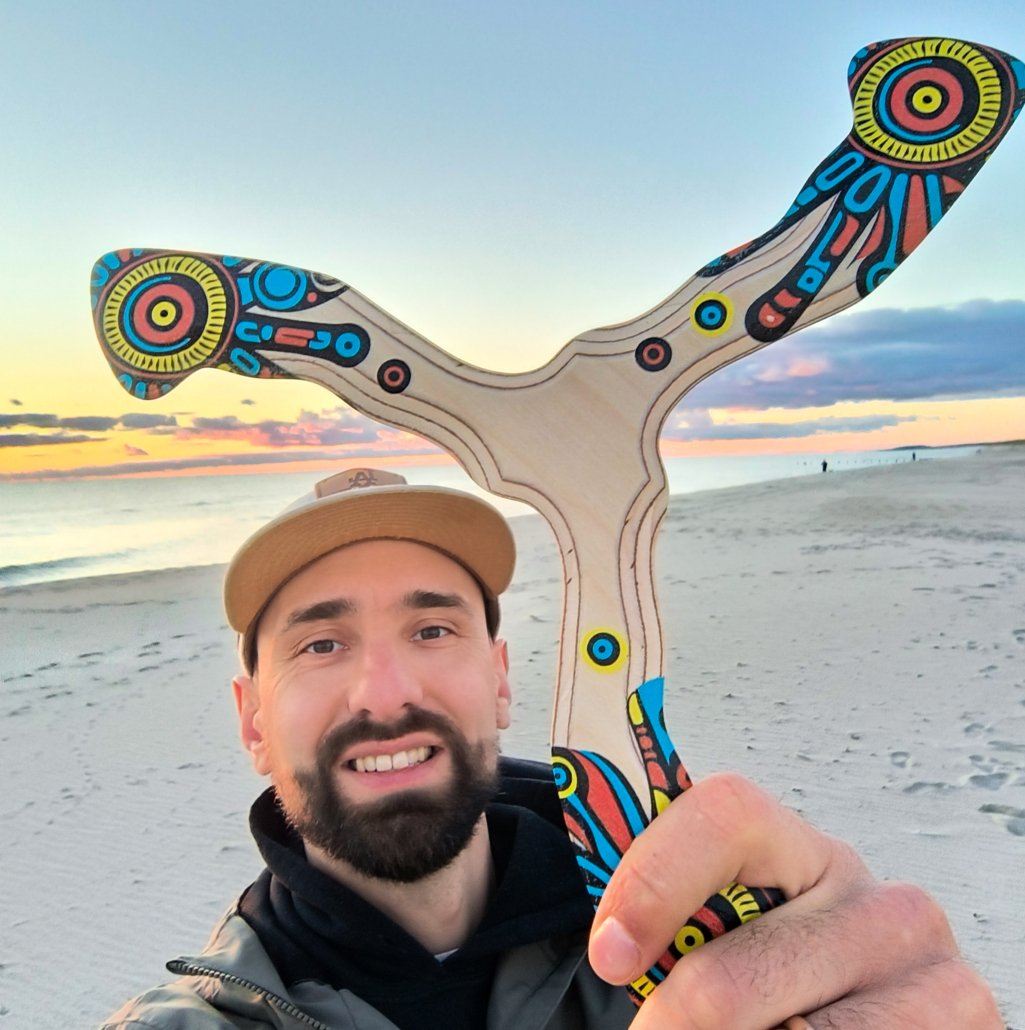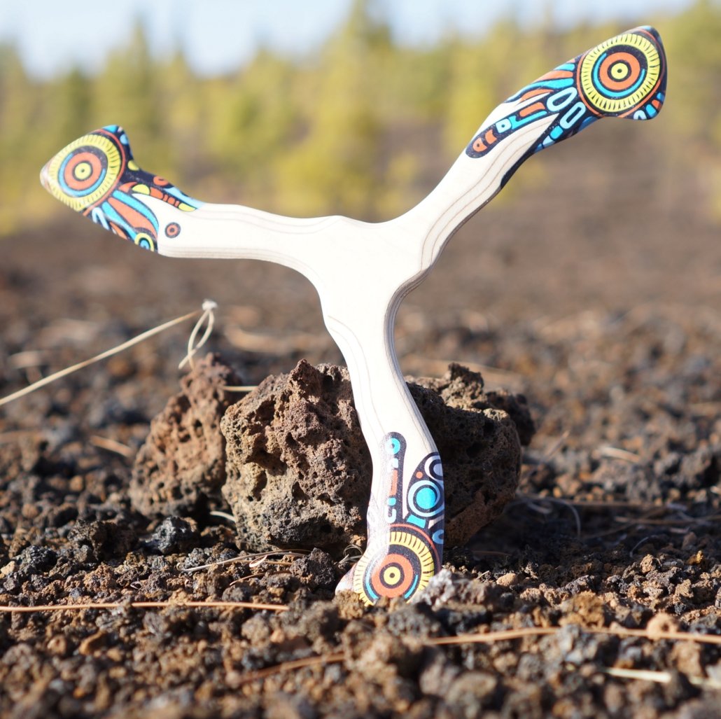„Šamanas“ – Tai grįžtantis trišakis bumerangas, papuoštas unikaliais raštais. Puikiai tinka tiek pradedantiesiems, tiek ieškantiems išskirtinės dovanos.